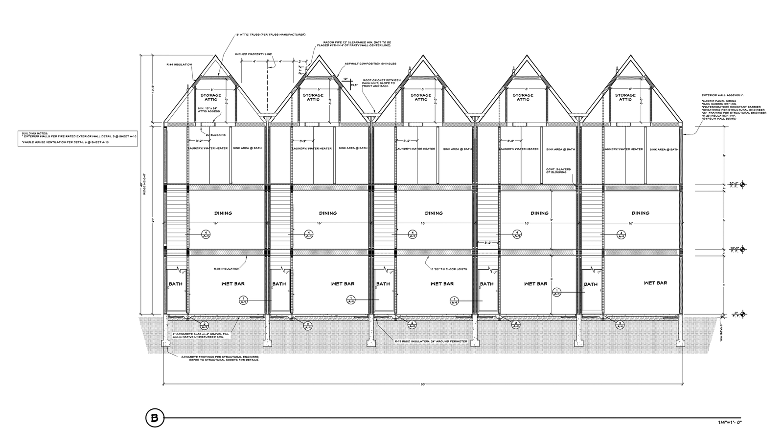 Home building plans service provider: Cross Section “A” of 26th Ave Townhomes in SE Alberta St. Portland Oregon. Designed Luis F. Miramontes, showcasing his detailed and accurate drafting work. The redline-clouded markings indicate plan-changes requested by project-owners, contractors and plan examiners as the plans are being produced.